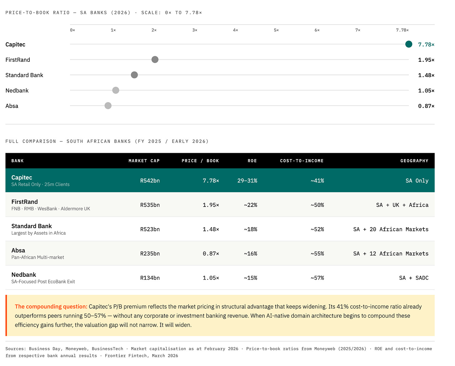 The price-to-book ratios sharpen this further. Capitec trades at 7.78 times book value. Standard Bank at 1.48 times. Absa at 0.87 times. This is not just a verdict on today’s earnings. It is a bet on compounding, the market pricing in the expectation that Capitec’s structural advantages will continue to widen faster than its competitors can close them.
