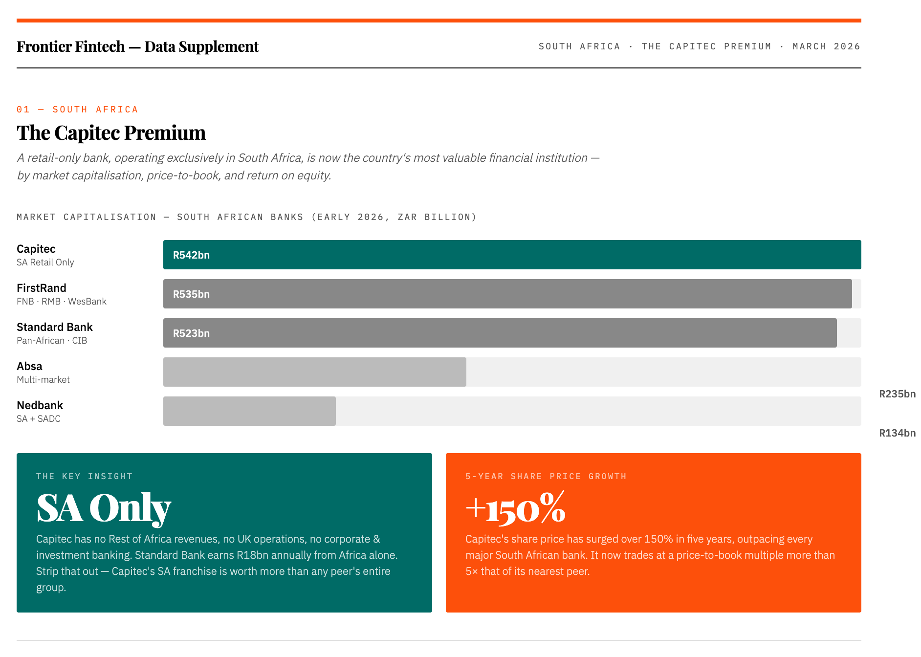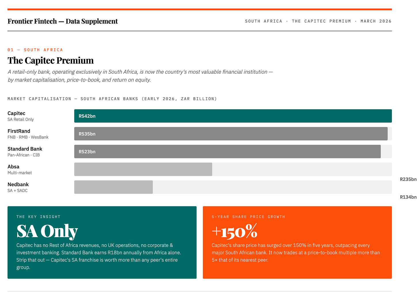 As of early 2026, Capitec has overtaken FirstRand to become South Africa’s most valuable bank at approximately R542 billion. FirstRand sits at R535 billion, Standard Bank at R523 billion, then a significant drop to Absa at R235 billion and Nedbank at R134 billion. What makes Capitec’s position remarkable is that unlike its peers, it operates almost entirely within South Africa, no Rest of Africa revenues, no UK operations, no corporate and investment banking franchise. Standard Bank generates R18 billion in annual headline earnings from its Rest of Africa business alone. Stripped of those contributions, the market is saying that Capitec’s pure South African retail franchise is worth more than any other bank’s entire group operation.