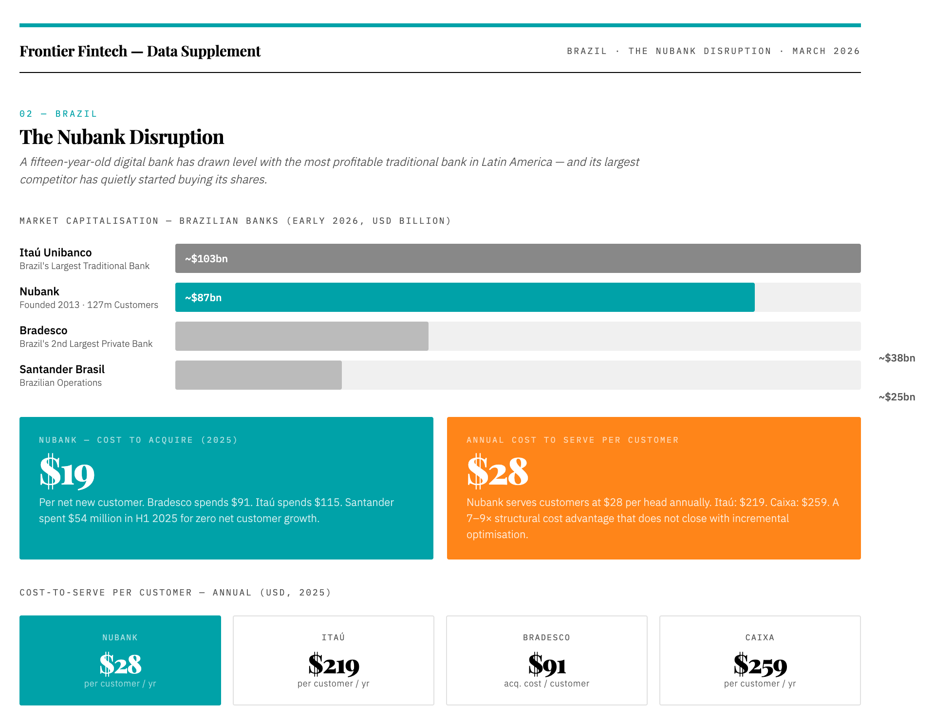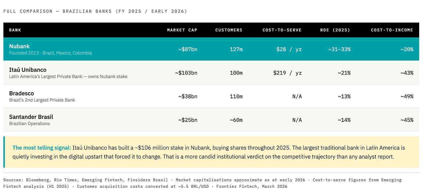 The Nubank data tells the same story from Brazil. Nubank currently sits at approximately $87 billion in market capitalisation, drawing level with Itaú Unibanco at $103 billion, a century-old institution still posting quarterly profits above $2 billion. Bradesco, Brazil’s second-largest private bank, sits at $38 billion. Most telling: Itaú has quietly been buying Nubank shares, which may be the most candid signal any incumbent has ever sent about where it believes the industry is going.